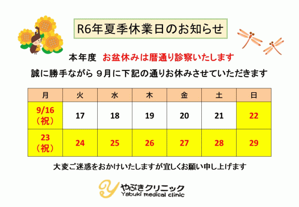 9月22日(日曜日)から9月29日(日曜日)までの平日を含む期間休診とさせていただきます。